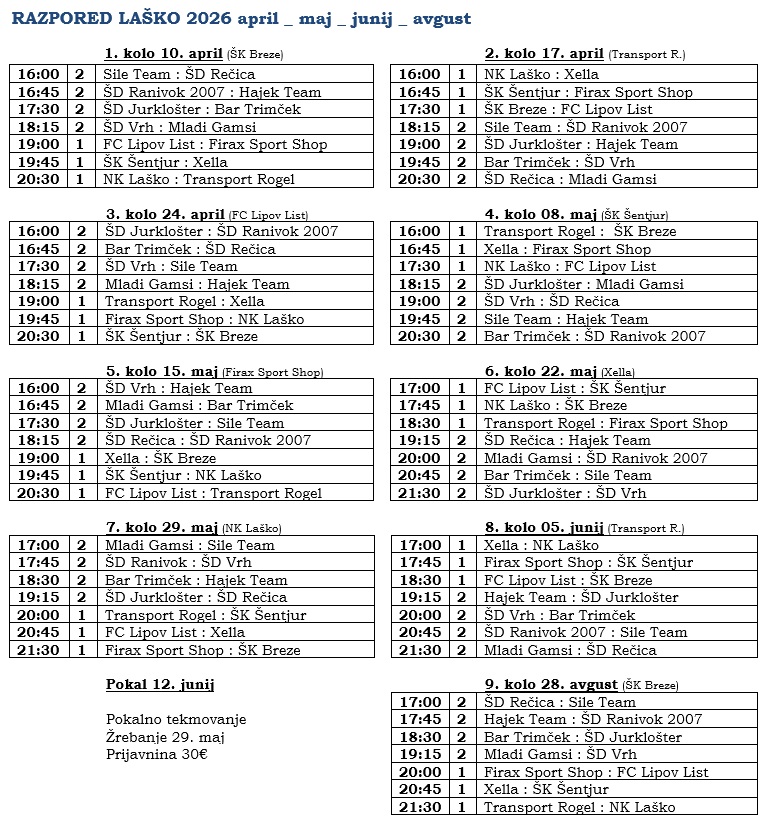 LETNA LIGA 2026 1. LigaPozEkipaTZIPDPGRTČ1FC Lipov List110042232ŠK Šentjur110020233Transport Rogel110043134ŠK Breze000000005NK Laško100134-106Firax Sport Shop100124-207Xella100102-20 2. LigaPozEkipaTZIPDPGRTČ1Hajek Team110082632ŠD Rečica110052333Okrepčevalnica Trimček110020234Mladi Gamsi110010135ŠD Vrh nad Laškim100101-106ŠD Jurklošter100102-207Sile Team100125-308ŠD Ranivok 2007100128-60 Rezultati prejšnega kroga Lestvica strelcev 1. LigaPoložajIgralecEkipaGoli1Luka BrglezFC Lipov List02Nik BratusaNK Laško03Tomaž KožarTransport Rogel04David KlančišarFC Lipov List05Matjaž VojskŠK Breze0Poglej vse igralce2. LigaPoložajIgralecEkipaGoli1Mitja LamperMladi Gamsi02Goran LokošekHajek Team03Luka AdrinekHajek Team04Miha ŠantejOkrepčevalnica Trimček05Sani AbramOkrepčevalnica Trimček0Poglej vse igralce PREPOVEDI za letno ligo IgralecEkipaLigaPrepoved igranja RAZPORED