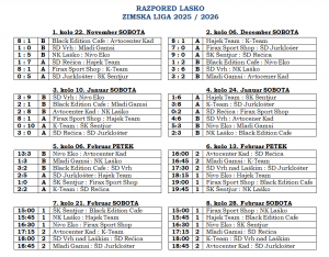 ZIMSKA LIGA Zimska 1. LigaPozEkipaTZIPDPGRTČ1*Nivo Eko32101679222*ŠK Šentjur3201871213*Firax Sport Shop3210734194*Hajek Team320113121155*Black Edition Cafe300349-5126*NK Laško3003212-108 Zimska 2. LigaPozEkipaTZIPDPGRTČ1*ŠD Rečica32011064102*ŠD Jurklošter3210633103*ŠD Vrh nad Laškim320175294*Mladi Gamsi31028806 Kartoni IgralecEkipaSkupinaPrepoved igranja Rezultati prejšnjega kroga Razpored in rezultati